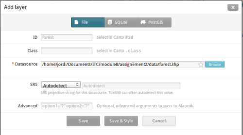 For Module8, at ITC we have been learning about MapServer and OpenLayers. In my case, I also been playing with TileMill. Here I explain all the steps needed to create a small map with tilemill.