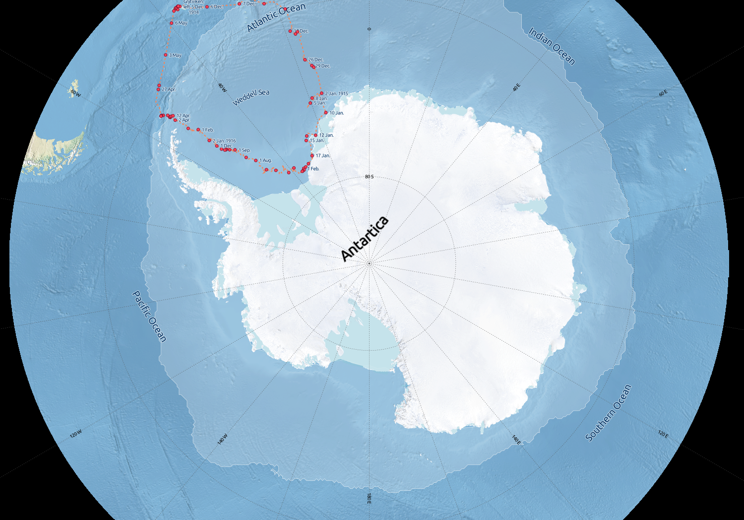Recently I’ve been reading Endurance: Shackleton’s Incredible Voyage. On the whole book they describe its current position, movement, etc.. but it’s difficult for me to understand certain positions on the poles. Also, the history is so astonishing that it deserved a cool map.