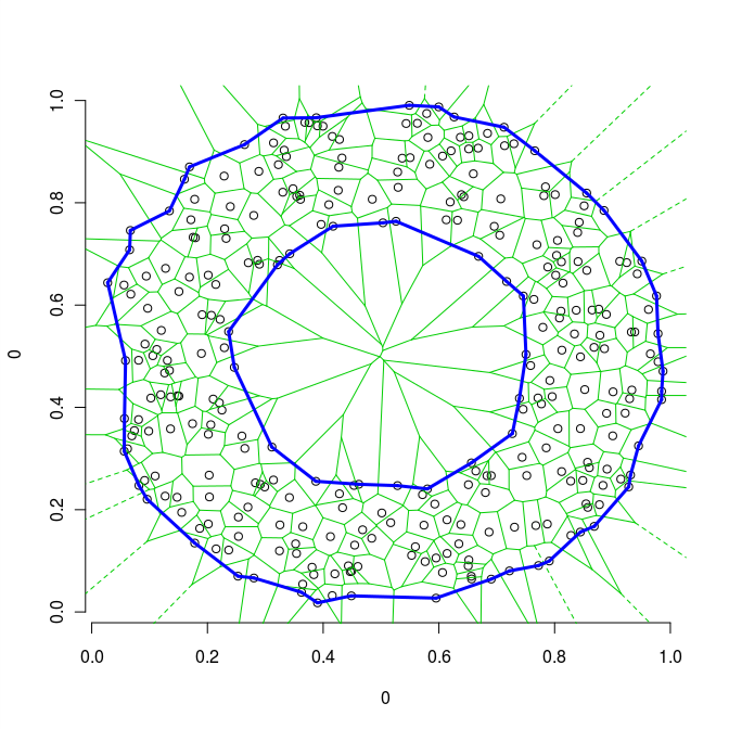 # Uniform sample of size n=300 in the annulus B(c, 0.5)\B(c, 0.25) # with c=(0.5, 0.5). n <- 300 theta<-runif(n,0,2*pi) r<-sqrt(runif(n,0.25^2,0.5^2)) x<-cbind(0.5+r*cos(theta),0.5+r*sin(theta)) # alpha-shape ashape.obj <- ashape(x, alpha = 0.1) #Plotting the alpha plot(ashape.obj, wlines= "vor", col = c(4, 1, 2, 3), lwd = c(1,3))