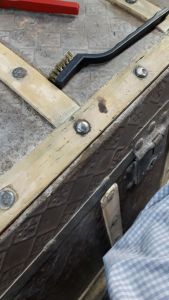 The exterior of the chest is made of rusty and ugly sheet metal. So it needs a little bit of sanding too. Not too much, but all the bolts were very rusty. A metal toothbrush will do the job: