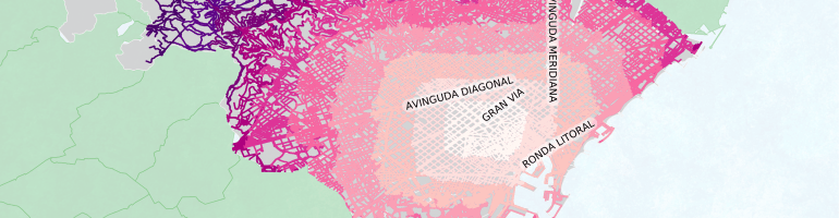 The colorscheme used is the 9-class RdPu from colorbrewer2 using the maximum 9 steps. The 9th step is changed a bit so we can actually add the 10th step that covers all Barcelona. So, from any given point in the city you have at maximum a 10km walk to the center 🙂