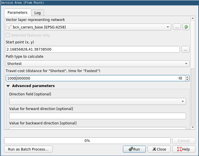 The Service area is self-explanatory. Select the vector layer representing network, in this case Barcelona streets as presented in OSM. The start point (2.16856828,41.38738500), our provided distance (1000 m) and the processing mode (distance). We’re using distance instead of speed in this case.