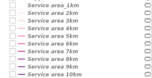 For my objective (distance from the center of Barcelona), I’m using the service area from a single point. 2.16856828,41.38738500 (more or less Plaça de Catalunya). This will be an iterative process, changing inputs from 1000m distances up to 10000m distances (1 to 10 km).