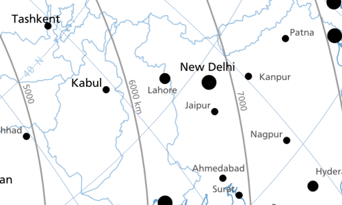 As seen on the projection preview there’s a big gap with water covering most of the outer parts. For the map I want to create (distances from Barcelona) I’ll take some liberties and limit it to places closer than 12000 Kms. This will exclude for example New Zealand (as you can see, it appears as a big stretched area on the right) and Australia.