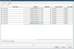 The buffers are very easy to perform, by using Qgis batch processing, we can set different buffer sizes on each step. Since the projection is in meters the buffer size it’s plain obvious, and since the projection is equidistant from the center point, the buffer result is a nice circle.